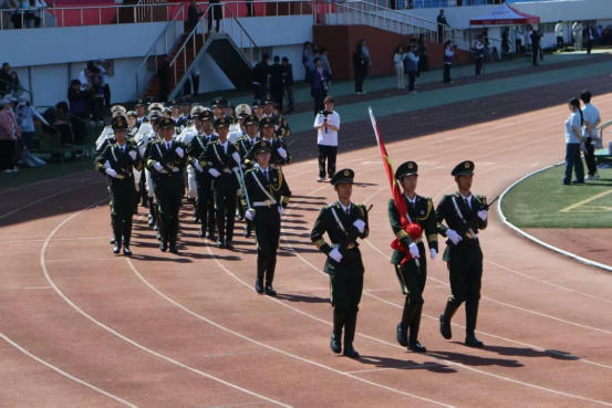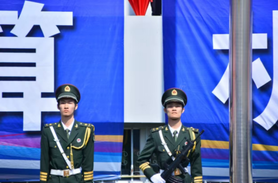 国旗班迈着整齐的步伐入场,在庄严的国歌声中,鲜艳的五星红旗冉冉升起。