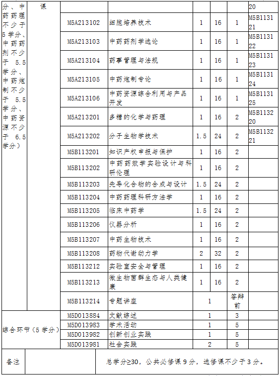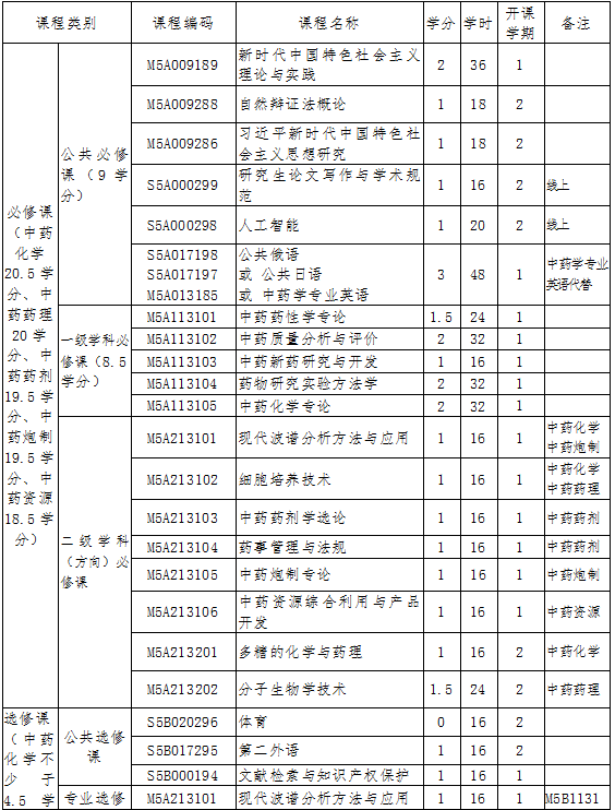 中药学学术学位硕士研究生学制为3-5年,课程学习时间为1年,其余时间完成培养方案所规定综合实践环节、科学研究和学位论文撰写等培养过程。