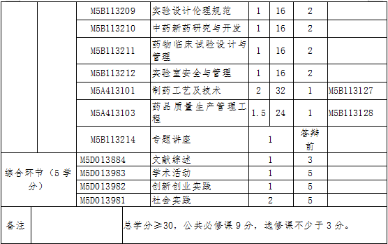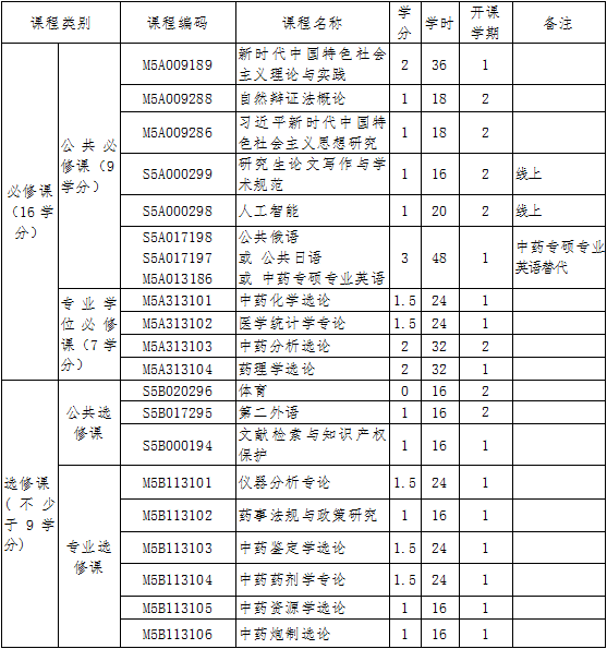全日制中药硕士专业学位研究生学制为3-5年(课程学习时间为1年),除课程学习的其余时间完成培养方案所规定综合实践环节和学位论文撰写等培养过程。