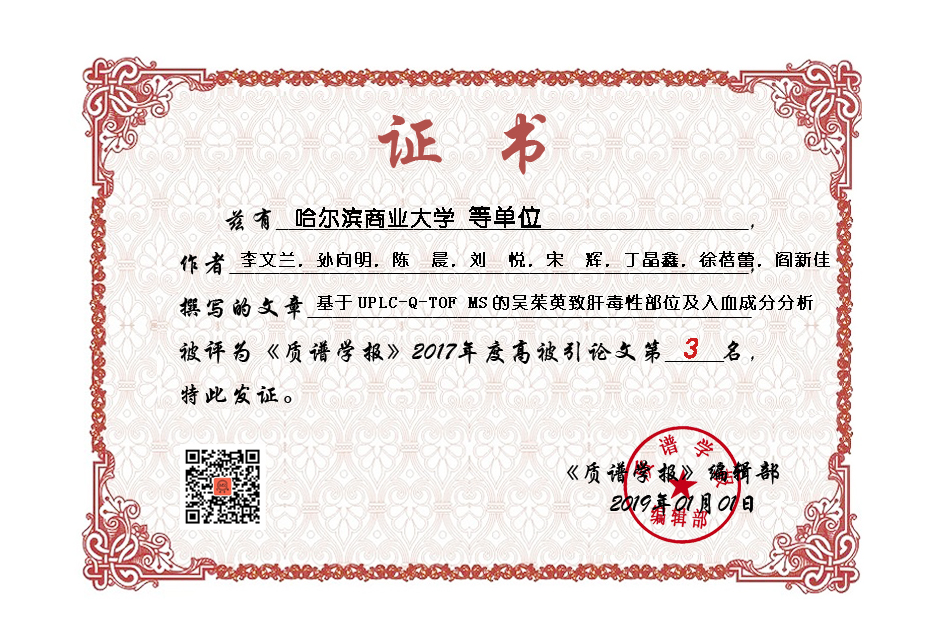 由李文兰教授等撰写的学术论文“基于UPLC-Q-TOF MS的吴茱萸致肝毒性部位及入血成分分析”发表于《质谱学报》2017年第38卷第3期,此论文被评为《质谱学报》2017年度高被引论文第3名。《质谱学报》系由北京中科科仪技术发展有限责任公司、中国物理学会质谱分会主办,该刊被EI工程索引(美)(2018)、Pж(AJ)文摘杂志(俄)(2014)、CSCD中国科学引文数据库来源期刊(2017-2018年度)(含扩展版)、北京大学《中文核心期刊要目总览》来源期刊、CA化学文摘(美)(2014)等数据库收录。该论文是基于李文兰教授所承担的科研项目取得的阶段性成果。