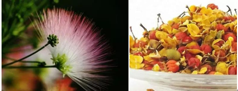 ◆合欢花:解郁安神,活血消肿,还可以美容养颜。皮和花皆可入药,花类药物质地轻,作用会比较缓和。