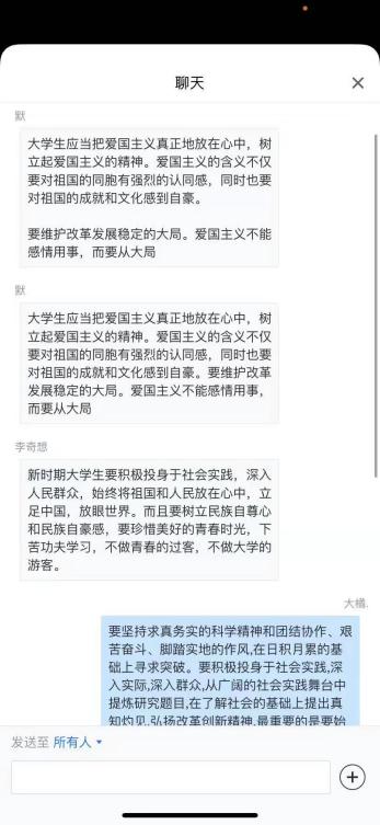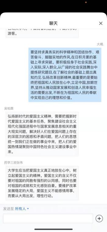 同看一部电影则是选择了围绕第一届中国人民政治协商会议而展开的《建党伟业》。在电影《建党伟业》中前赴后继的仁人志士让学生们感到动容,由此也引申出了许多思考。2018级中药1班王毛毛认为大学生应当把爱国主义真正地放在心中,树立起爱国主义的精神。同时他也对爱国主义的含义做出了自己的解释:“不仅要对祖国的同胞有强烈的认同感,同时也要对祖国的成就和文化感到自豪”。2019级药学2班都广平认为新时期大学生要树立民族自尊心和民族自豪感,要珍惜美好的青春时光,下苦功夫学习,不做青春的过客,不做大学的游客。