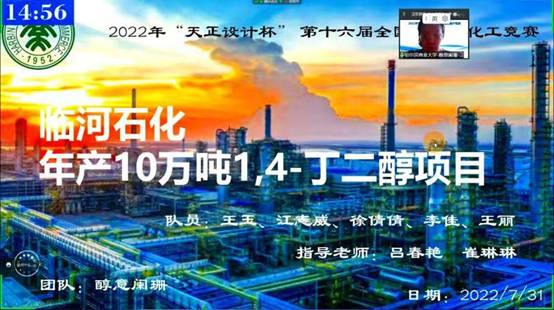 该项赛事参赛者均为全日制在校本科生,以五人团队的形式参赛,参赛队伍根据竞赛命题和要求完成设计,提交设计作品,本届竞赛的题目是《为某大型化工企业设计一座1,4-丁二醇生产分厂或为现有的1,4-丁二醇生产分厂设计技术改造方案》,共历时6个月。本次竞赛遵循《中国制造2025》指出的发展方针,以创新驱动,发展资源多元化、低耗、高效、安全、清洁的绿色制造技术。参赛团队从项目可行性论证、工艺流程、设备选型、车间布置、厂区布置、经济分析、安全性评价等几个模块对分厂进行可行的工程技术模拟及设计,并利用Aspen Plus、PPT、3D漫游技术等现代化软件对其设计进行多维度展示,培养了大学生的创新思维、工程技能、团队协作精神等,提高了大学生的工程设计与实践能力,落实了“卓越工程师教育培养计划”。经过层层选拔,我校的“醇意阑珊”团队获得全国大学生化工设计竞赛二等奖。