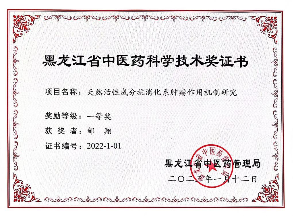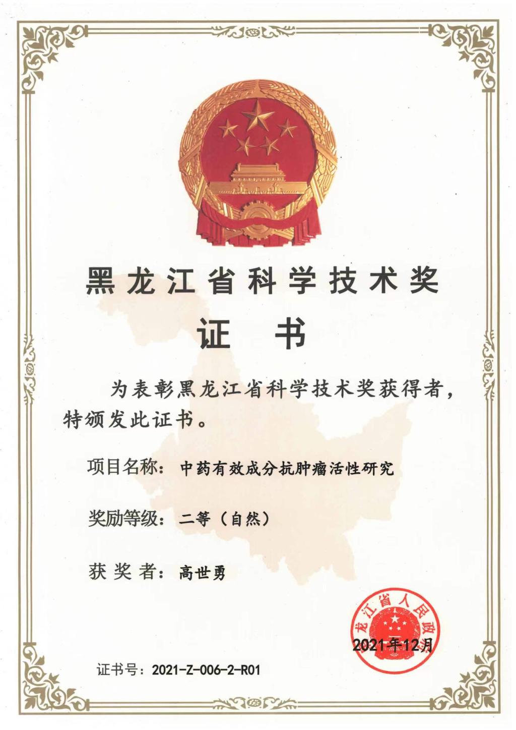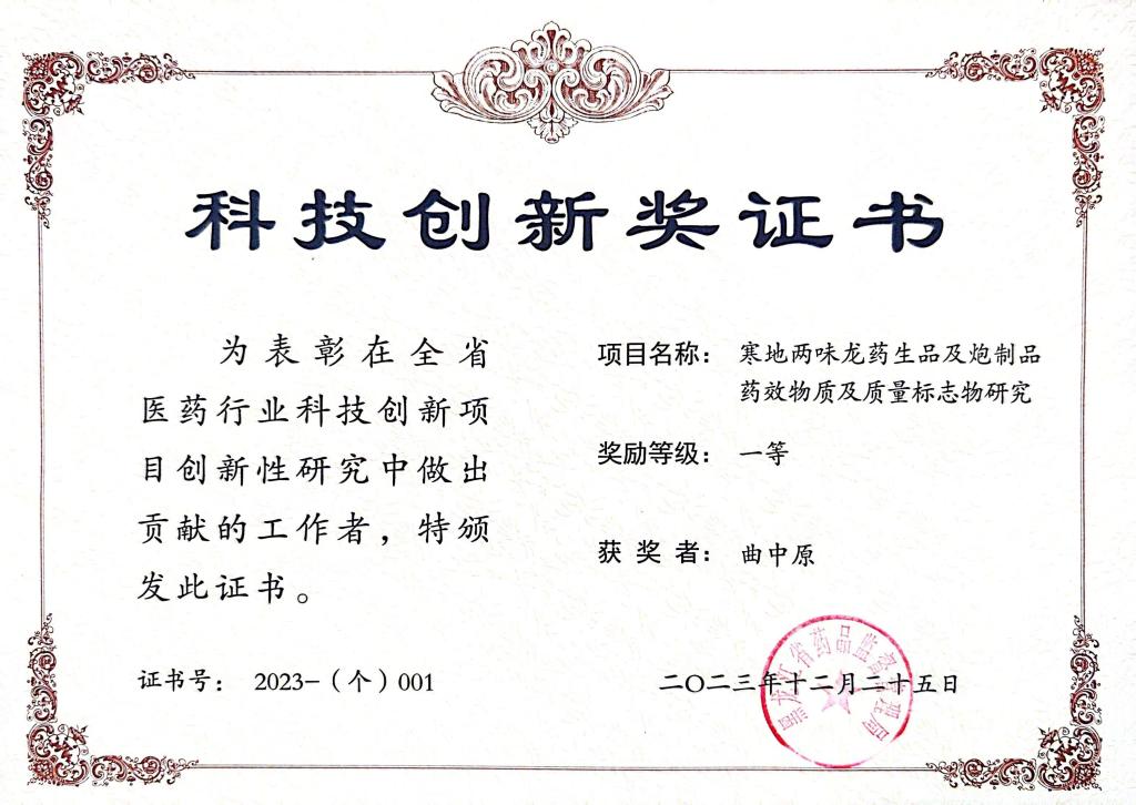 团队带头人曲中原教授获黑龙江省医药行业科技创新一等奖