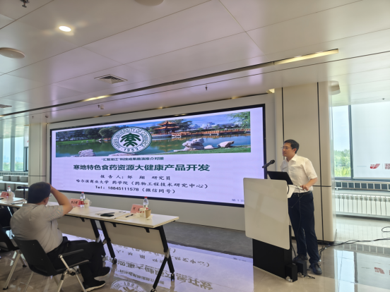 哈尔滨商业大学药学院(药物工程技术研究中心)邹翔副主任进行了《寒地特色食药资源大健康产品开发》的科技成果推介,并由生物医药、功能性食品等领域的需求企业代表与专家分组洽谈对接,分别就注射用双黄连分离纯化研究、中药大品种二次开发、大功率超声波高效提取寒地药食同源活性成分及其功能产品开发进行了深入交流并达成了意向性合作。