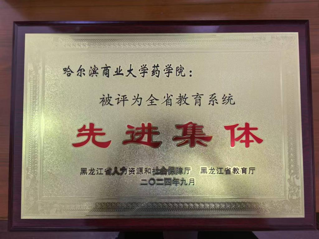 近日,在黑龙江省人力资源和社会保障厅、黑龙江省教育厅组织开展的2024年全省教育系统先进集体和先进个人评选表彰活动中,哈尔滨商业大学药学院荣获“2024年全省教育系统先进集体”荣誉称号。