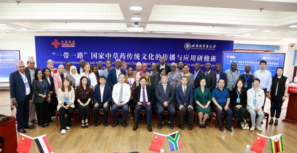 9月12日上午,由商务部主办、哈尔滨商业大学承办的“一带一路”国家中草药传统文化的传播与应用研修班开班典礼在我校举行。黑龙江省商务厅对外投资和经济合作处处长都书峰、对外投资和经济合作处二级调研员杨家滨;我校副校长王福友,国际交流合作处处长金向阳、药学院党委书记张铁锋、药学院院长李文兰、药物工程技术研究中心副主任高世勇,国际交流合作处援外项目主管杨蕾;药物工程技术研究中心于淼研究员、綦峥研究员、崔迪副研究员、任广明副研究员,药学院赵金椽老师等授课教师代表,以及来自埃及、尼泊尔、南非等7个国家的30名学员参加开班典礼。李文兰主持开班典礼。