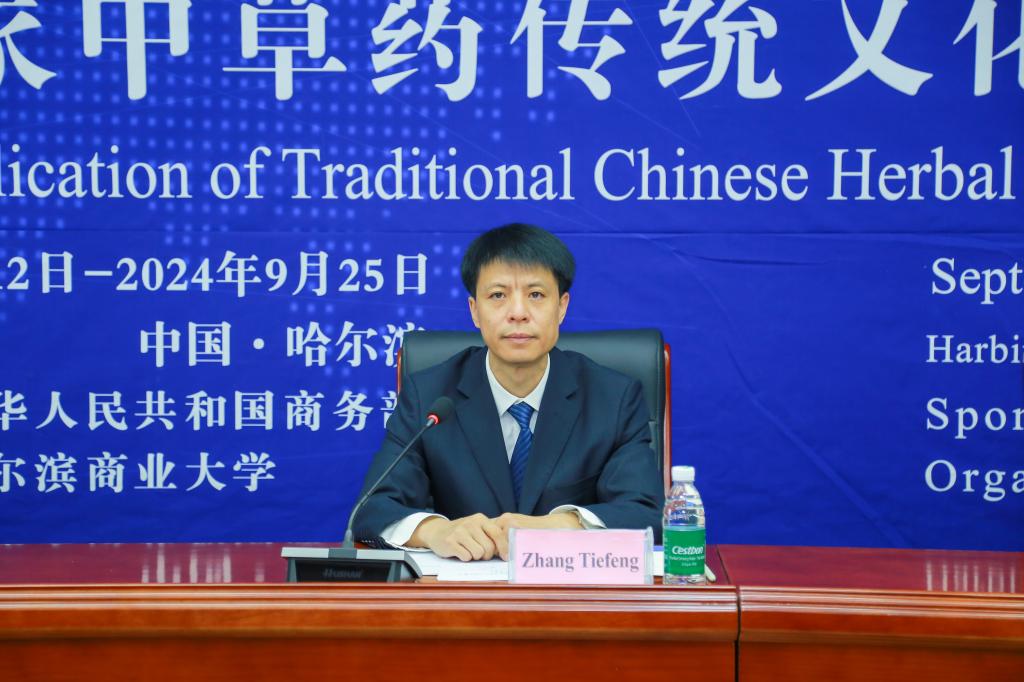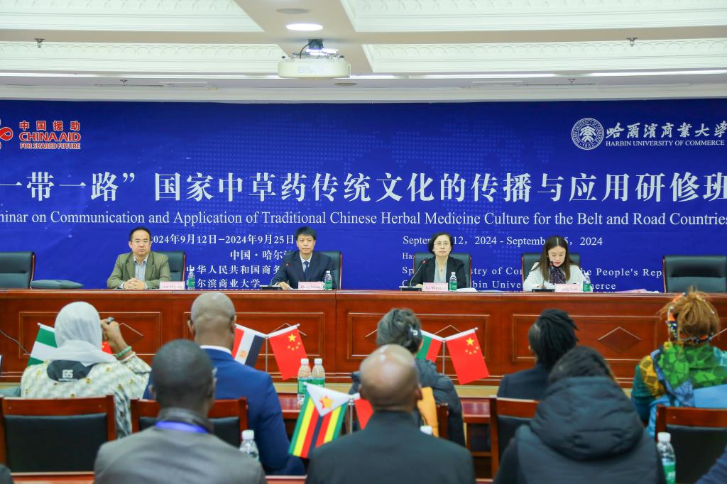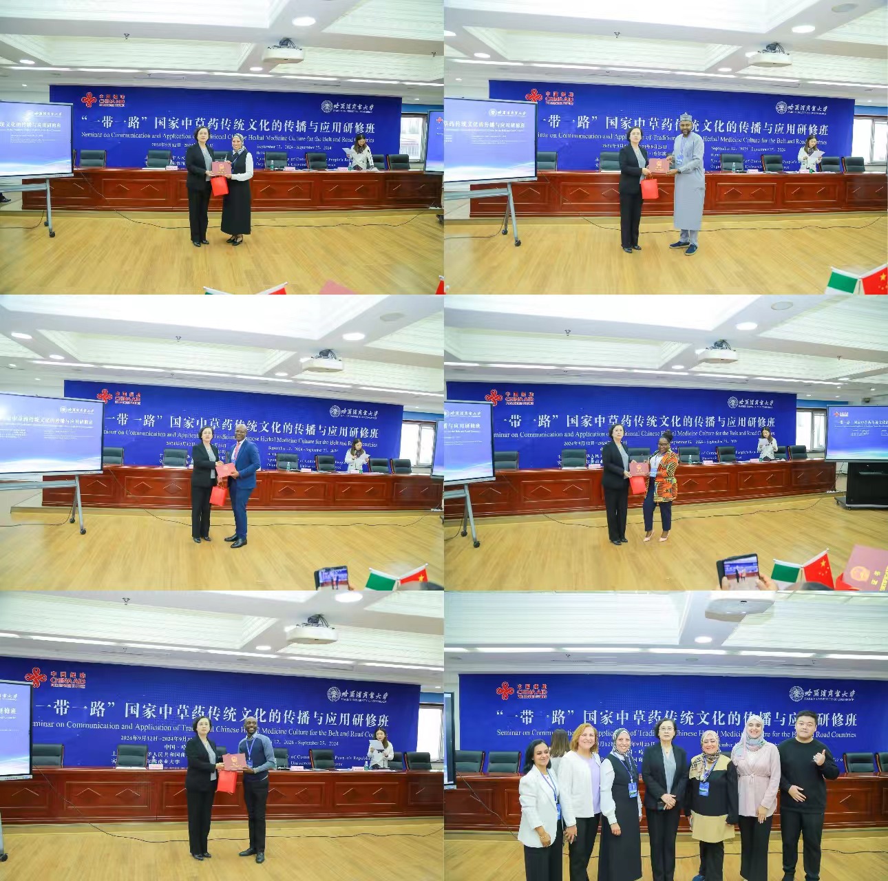 9月25日上午,由中华人民共和国商务部主办、哈尔滨商业大学承办的“一带一路”国家中草药传统文化的传播与应用研修班结业典礼在哈尔滨商业大学举行。哈尔滨商业大学药学院党委书记张铁锋、药学院院长李文兰、药物工程技术研究中心副主任高世勇、国际交流合作处援外项目主管杨蕾、药物工程技术研究中心和药学院教师代表,以及来自埃及、保加利亚、尼泊尔、坦桑尼亚、南非、津巴布韦、尼日利亚7个国家的30名学员参加典礼,张铁锋主持研修班结业典礼仪式。