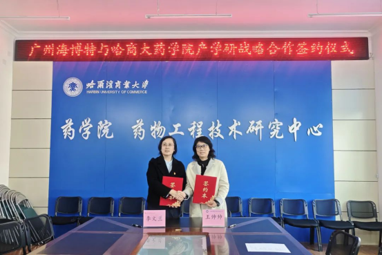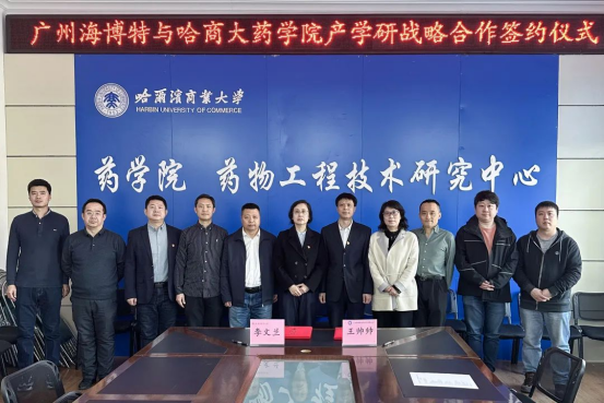 2025年4月3日,哈尔滨商业大学药学院与广州海博特医药科技有限公司(以下简称“海博特”)战略签约仪式在哈尔滨商业大学举行。哈尔滨商业大学药学院党委书记张铁锋、院长李文兰、药学院校友—海博特董事长兼总经理王帅帅出席签约仪式,药学院领导班子、秘书及企业代表参加。