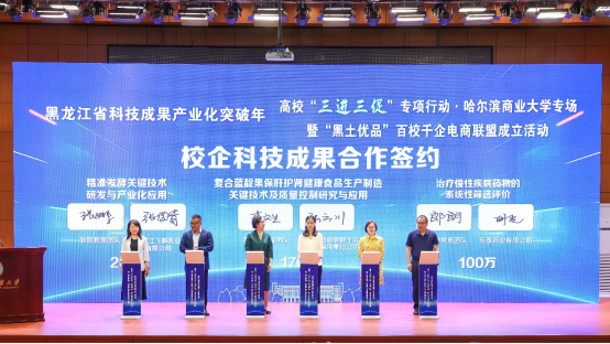 6月13日,黑龙江省科技成果产业化突破年高校“三进三促”专项行动·哈尔滨商业大学专场暨“黑土优品”百校千企电商联盟成立活动成功举办。省教育厅党组成员、副厅长曹叠峰,哈尔滨商业大学党委书记赵广,五常市委书记、市长刘亮等分别致辞。省科学技术厅、团省委、省农业农村厅、省商务厅、省委网信办有关领导,10余名市、区、县领导,省内78所高校主管科技成果转化工作的校领导和相关部门主要负责同志,以及市、区、县科技招商部门和相关企业代表、高校农业科技成果转化联盟和“黑土优品”百校千企电商联盟负责同志参加活动。我院参加了转化成果展示,李文兰教授、郎朗研究员分别与企业签订校企科技成果合作协议。