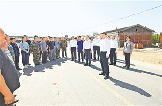 9月6日至8日,中共中央总书记、国家主席、中央军委主席习近平在黑龙江考察。这是7日上午,习近平在遭受洪涝灾害的哈尔滨尚志市老街基乡龙王庙村,同当地村民和施工人员亲切交流。