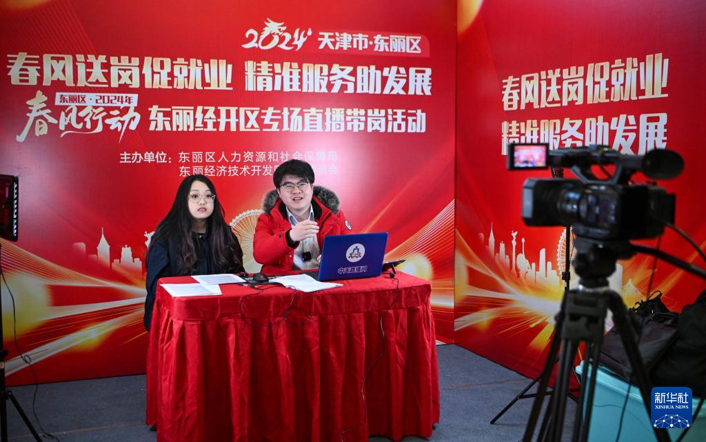 2024年2月29日,主播在天津市东丽区一场招聘会上进行直播带岗。新华社记者 孙凡越 摄