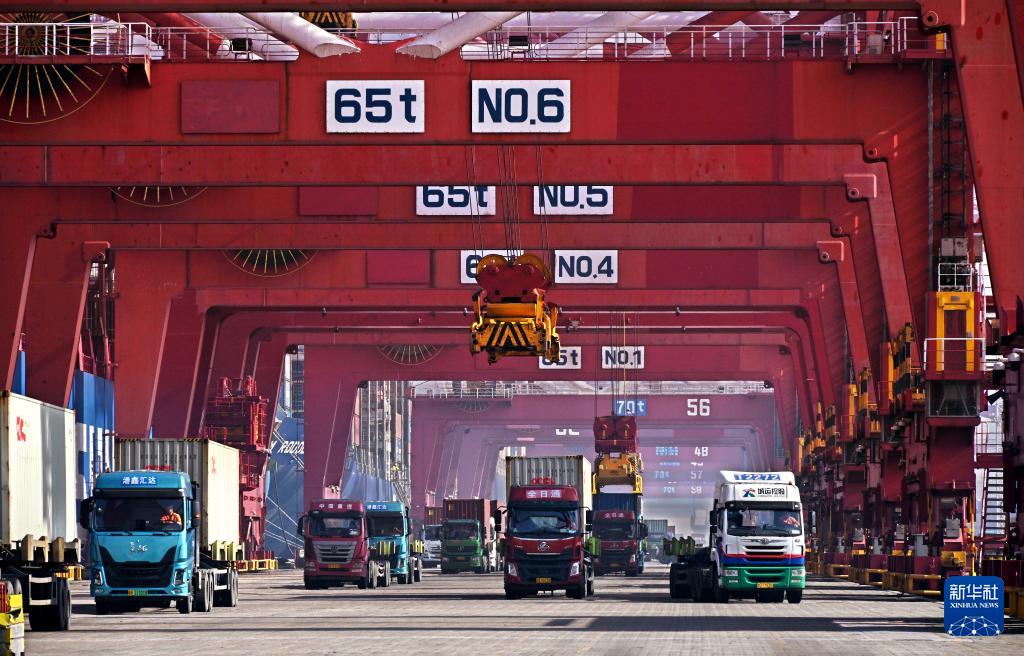 2024年2月11日,卡车在青岛港集装箱码头装运集装箱。新华社记者 李紫恒 摄